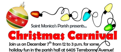 St. Monica's Parish will host its annual Christmas Carnival on December 7 from 12:00 PM to 3:00 PM. Join us for holiday food, fun, and games at the parish hall. Tickets are $15, with family discounts available.